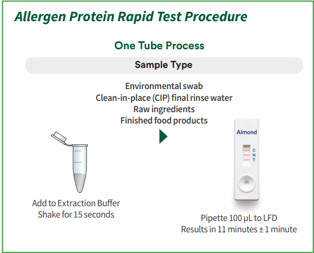 - Rask, kvalitativ immunokromatografisk lateral flow testpatroner designet for påvisning av allergene matproteiner.